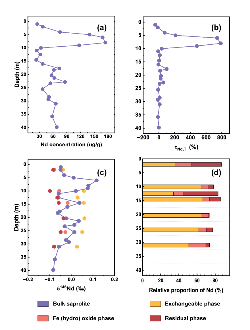 图1. 花岗岩风化剖面全岩样品中(a)Nd浓度和(b)Nd搬迁率(τNd,Ti)的改变;(c)全岩样品和不同化学提取相态的δ146Nd值;(d)不同化学提取相态中Nd的份额。