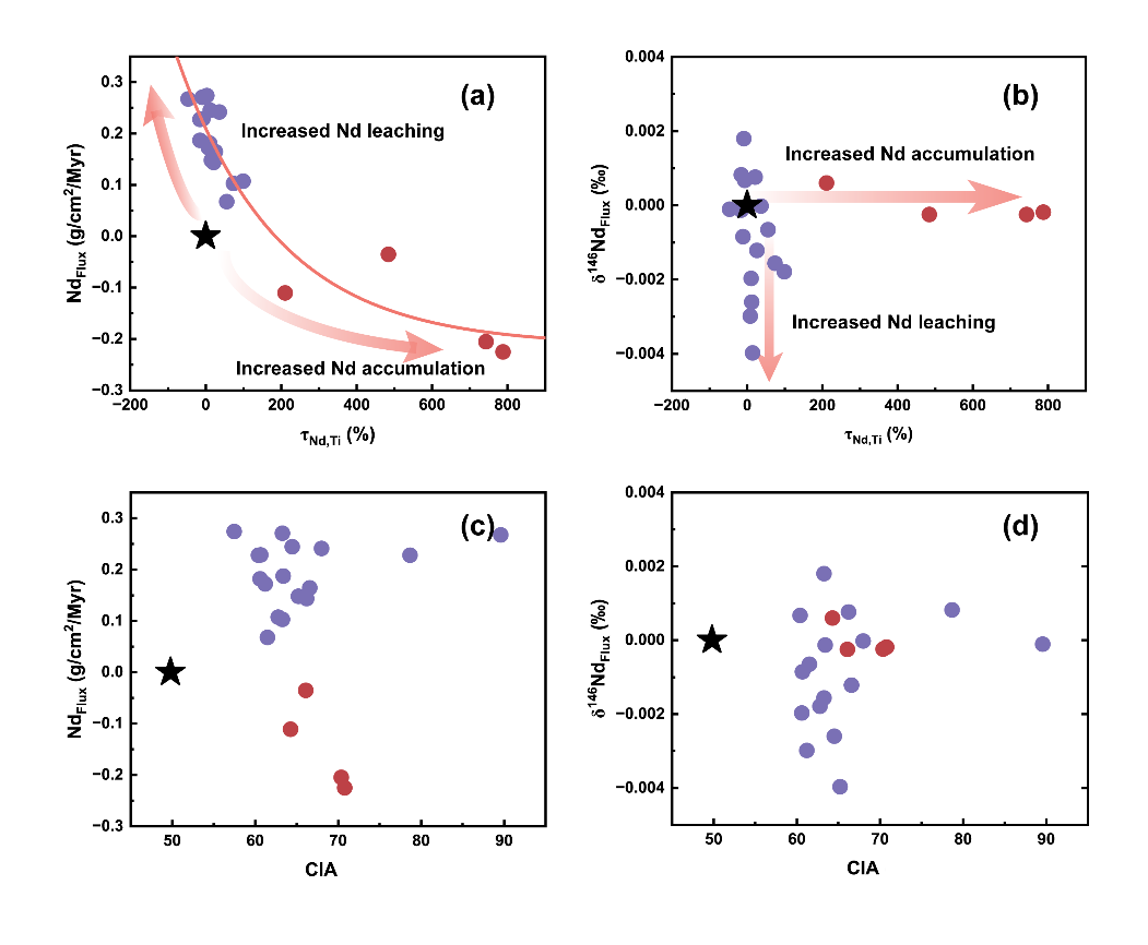 图2.花岗岩风化剖面中τNd,Ti与(a)Nd元素通量(NdFlux)以及(b)Nd同位素通量(δ146NdFlux)的关;化学蚀变指数(CIA)与(c)NdFlux和(d)δ146NdFlux的联系。黑色五角星代表未风化基岩,赤色圆点代表Nd堆集量明显的样本,编号为TT-5、TT-6、TT-8和TT-9。